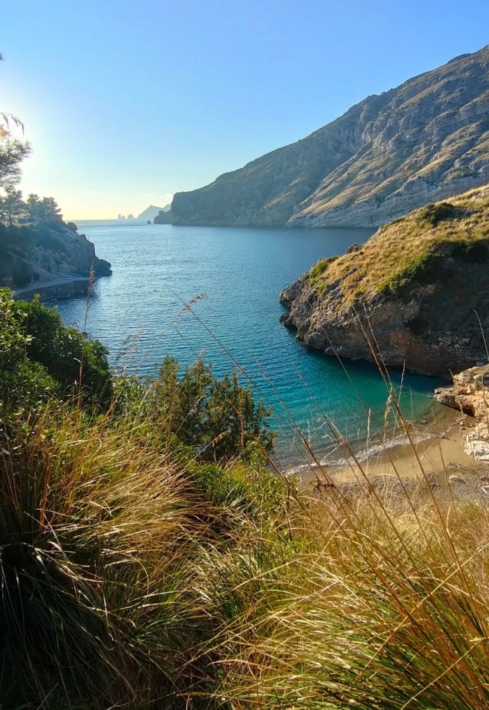 Quella che abbiamo visitato é la famosissima baia di Ieranto, un luogo incredibile, quasi un fiordo, nascosto in questa lingua di terra che si spinge nel mare, segnando un confine naturale tra le province di Napoli e Salerno. L’isola di Capri e i suoi faraglioni sono là, a portata di vista e quasi sembrerebbe a portata di nuotata.